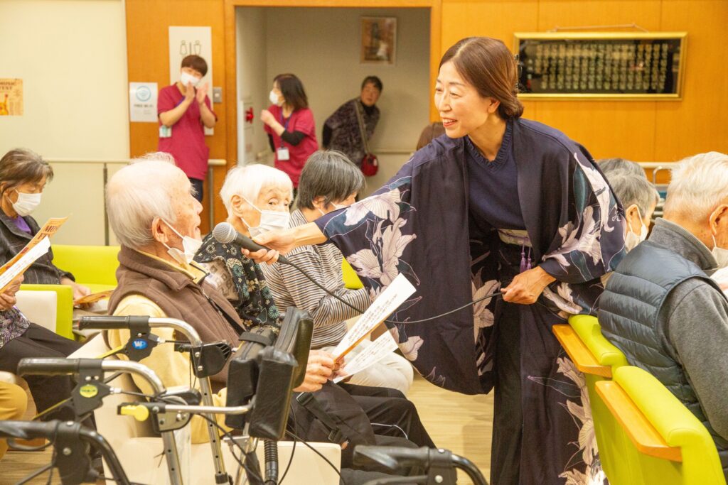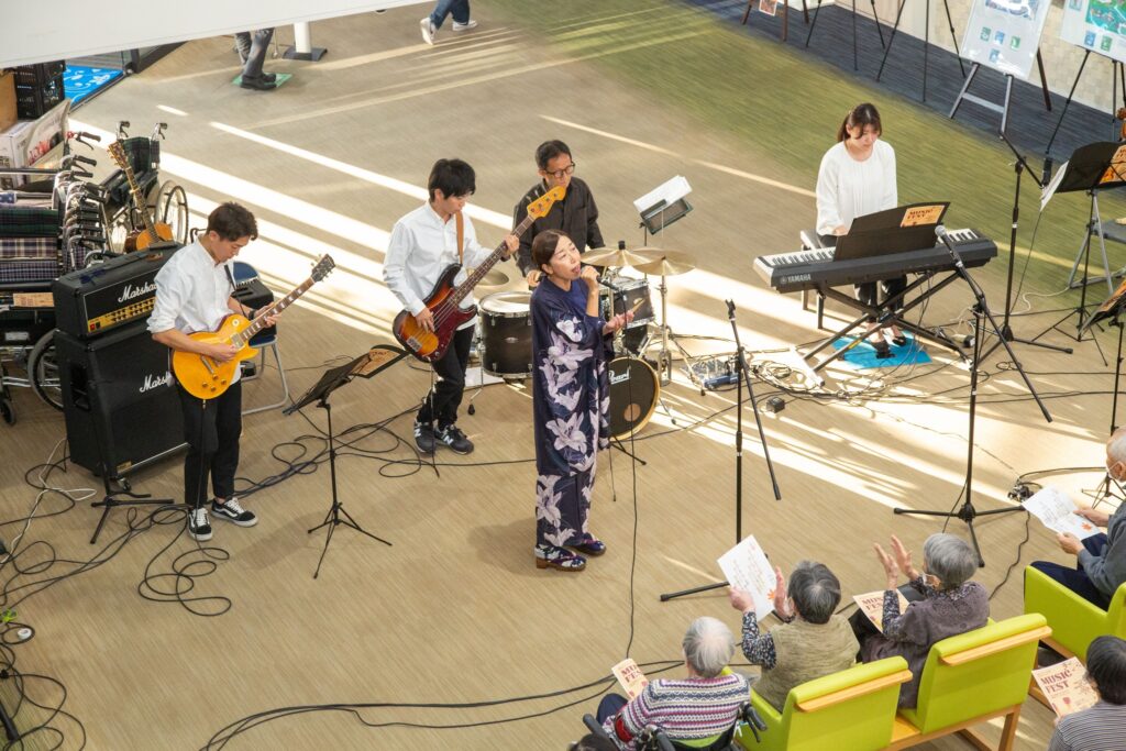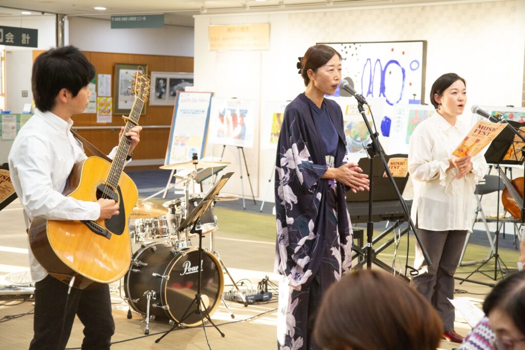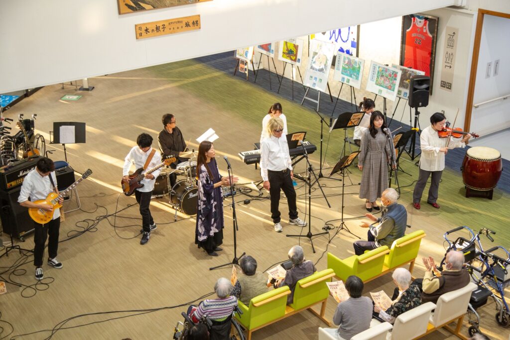「みんなで歌える歌を入れたいね」ということで、秋らしくもみじ。今回は二部合唱にも挑戦しつつ、チラシの裏面に書いた歌詞を見て歌ってもらいました。藤木卓OTの素敵なギターを伴奏に気持ち良く歌えました♪