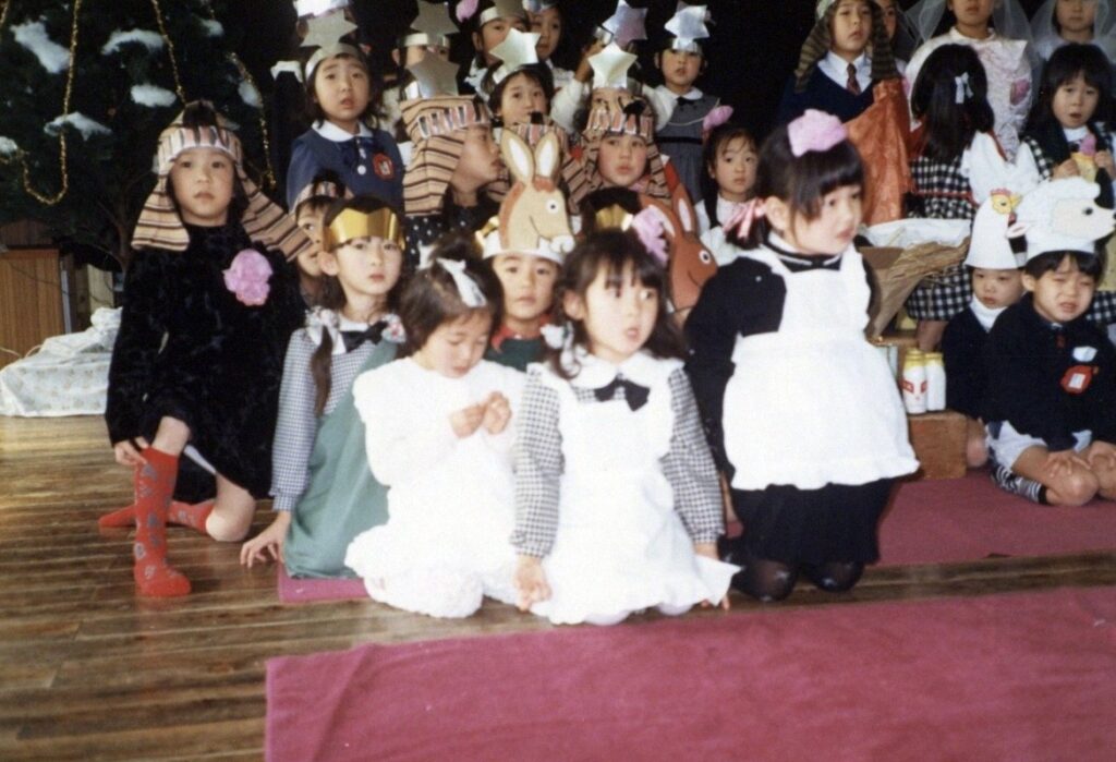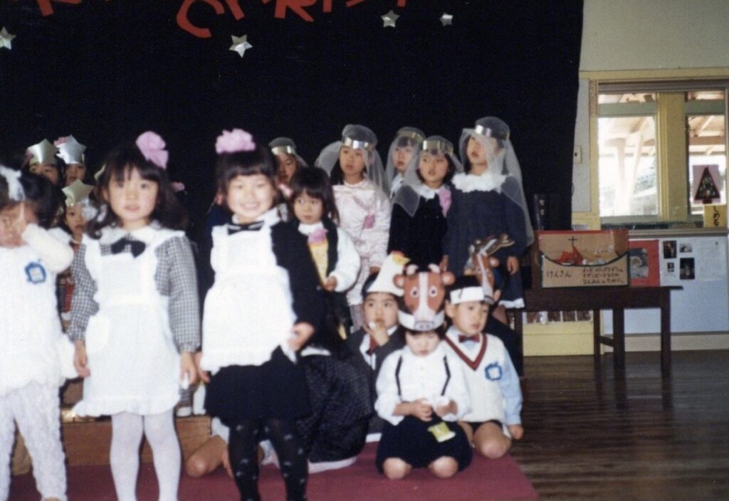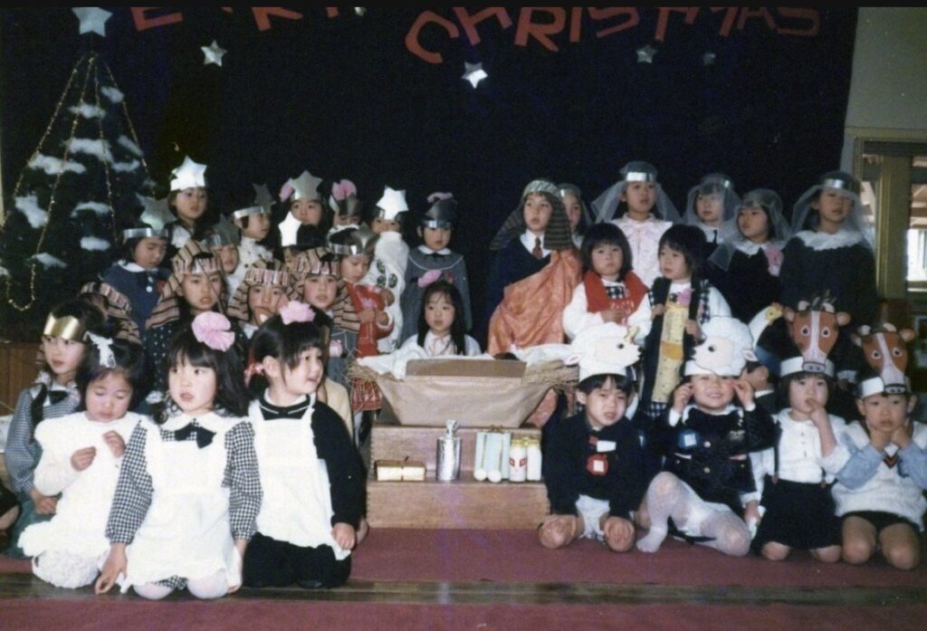 私は浄土真宗なのですが、幼稚園はキリスト教会に併設だったので、クリスマスには降誕劇を演じていました。少人数の幼稚園だったので年少から年長まで総出で演じていました。なので3回演じたはずですが、写真に残っていたのは年少のときに演じた「キリスト誕生を祝う子ども」の役で「おめでとうございます」的なことを言って並んだ記憶がうっすらあります。