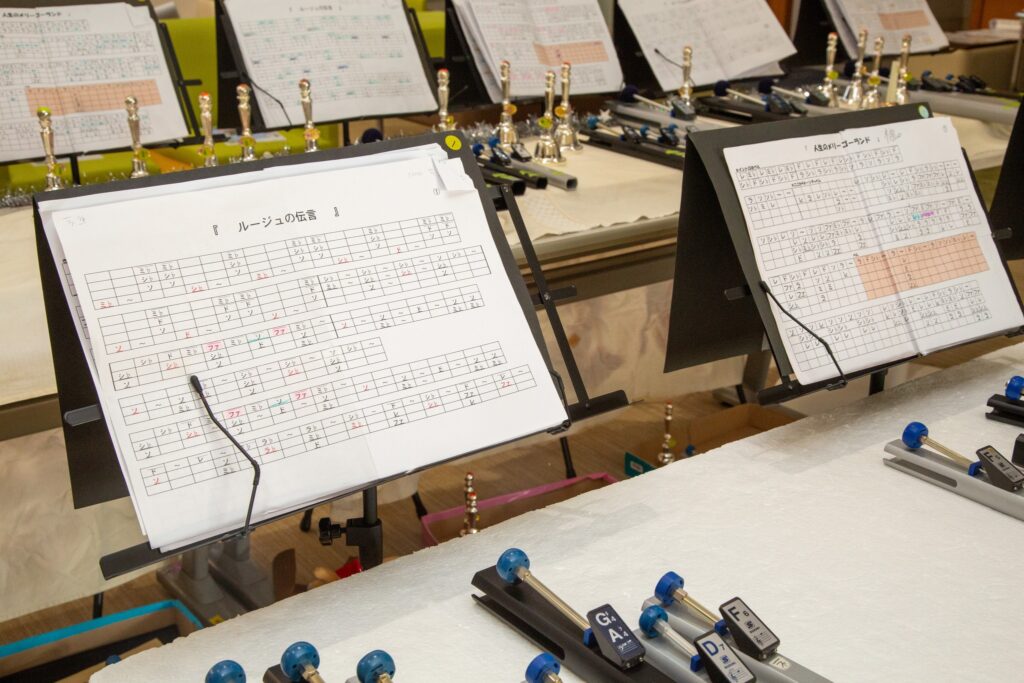 そんなわけで念願叶って嬉しくてニヤニヤしている私と、小道具なども自作してくる気合いの入った高校生の皆さん…ステキ♡なんとなく「ハンドベルって一人一音なのかな」と思っていましたが、ハンドベルとトーンチャイム、合わせて7個くらいの音を担当しているようです。しかも曲によって変えるんですって。すごい!!