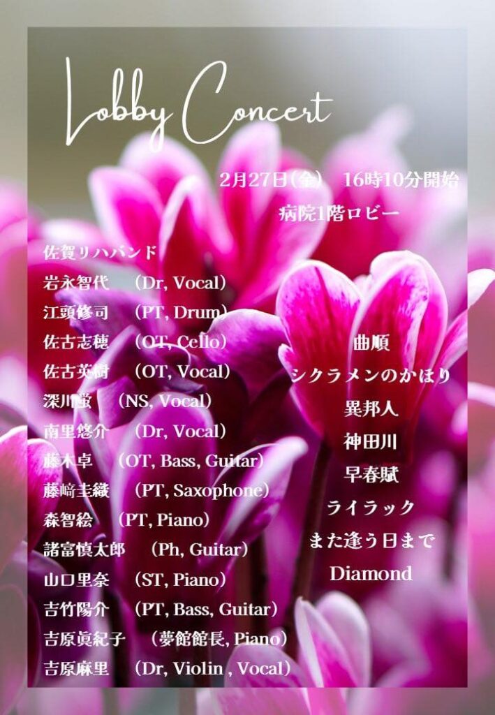 そもそもの始まりは私がロビーコンサートでピアノを演奏してくれる人を探していたことでした。これまで、佐賀リハバンドでは山口里奈STと森智絵PTがピアノを演奏してくれていましたが、どんどん曲数も難易度も上がっていっていたので「何人かピアニストがいたら分担できて良いよね」なんて話していたのです。