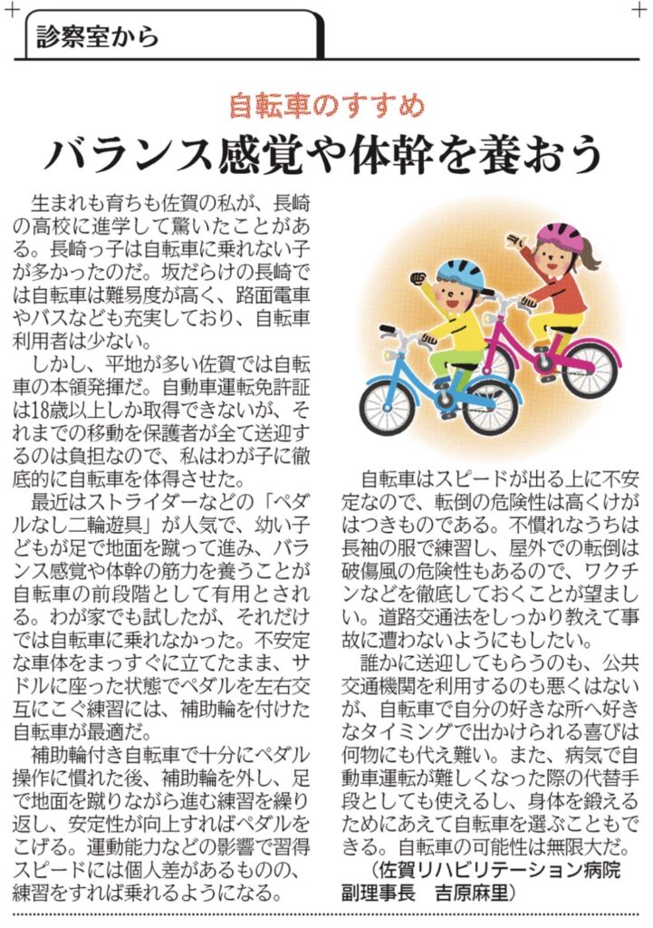自転車のすすめ バランス感覚や体幹を養おう (2026年2月28日の佐賀新聞より)
