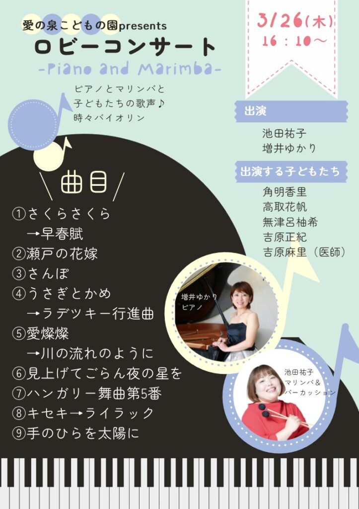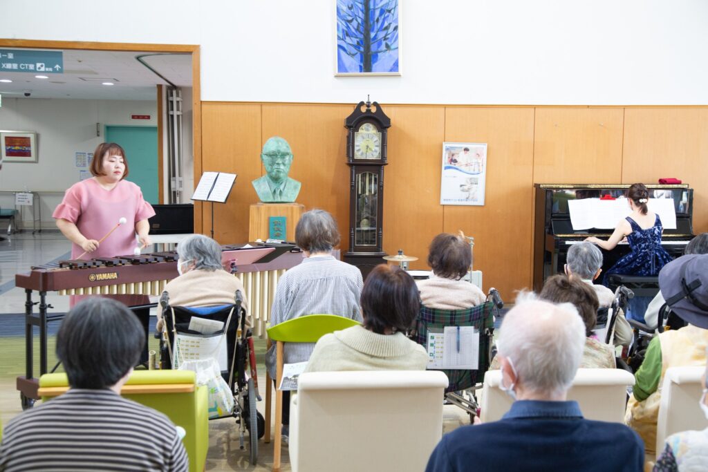 子ども達がお世話になった保育園の園長先生より、ロビーコンサートのプレゼントをいただきました。保育園の音楽教室をしてくださっているマリンバの池田先生とピアノの増井先生が、病院で音楽教室ならぬロビーコンサートを開催してくださることになりました。